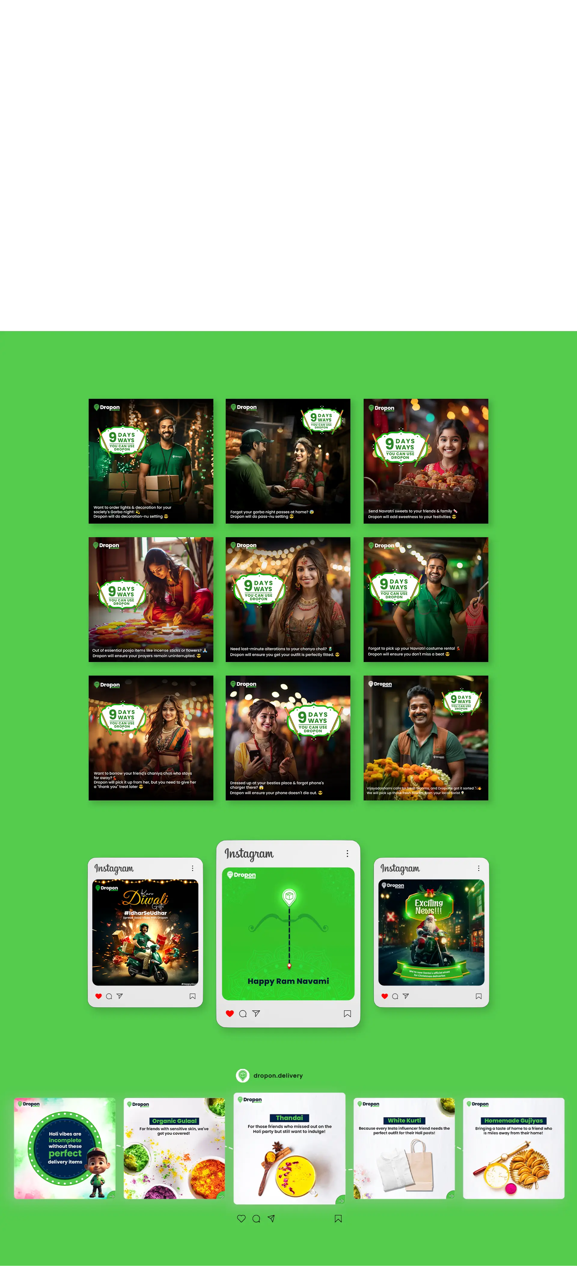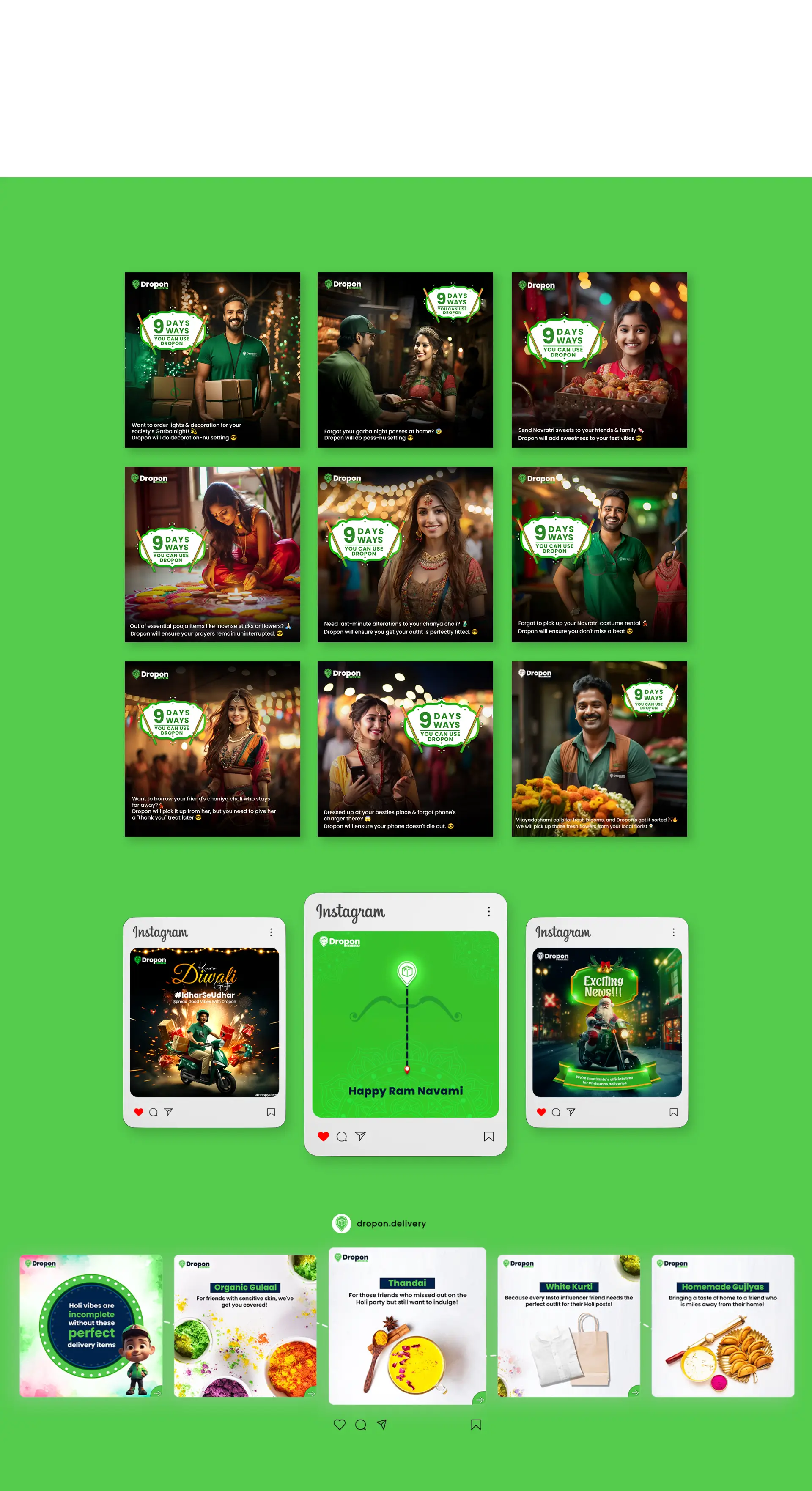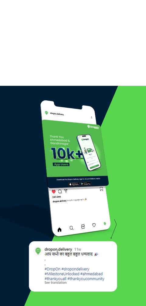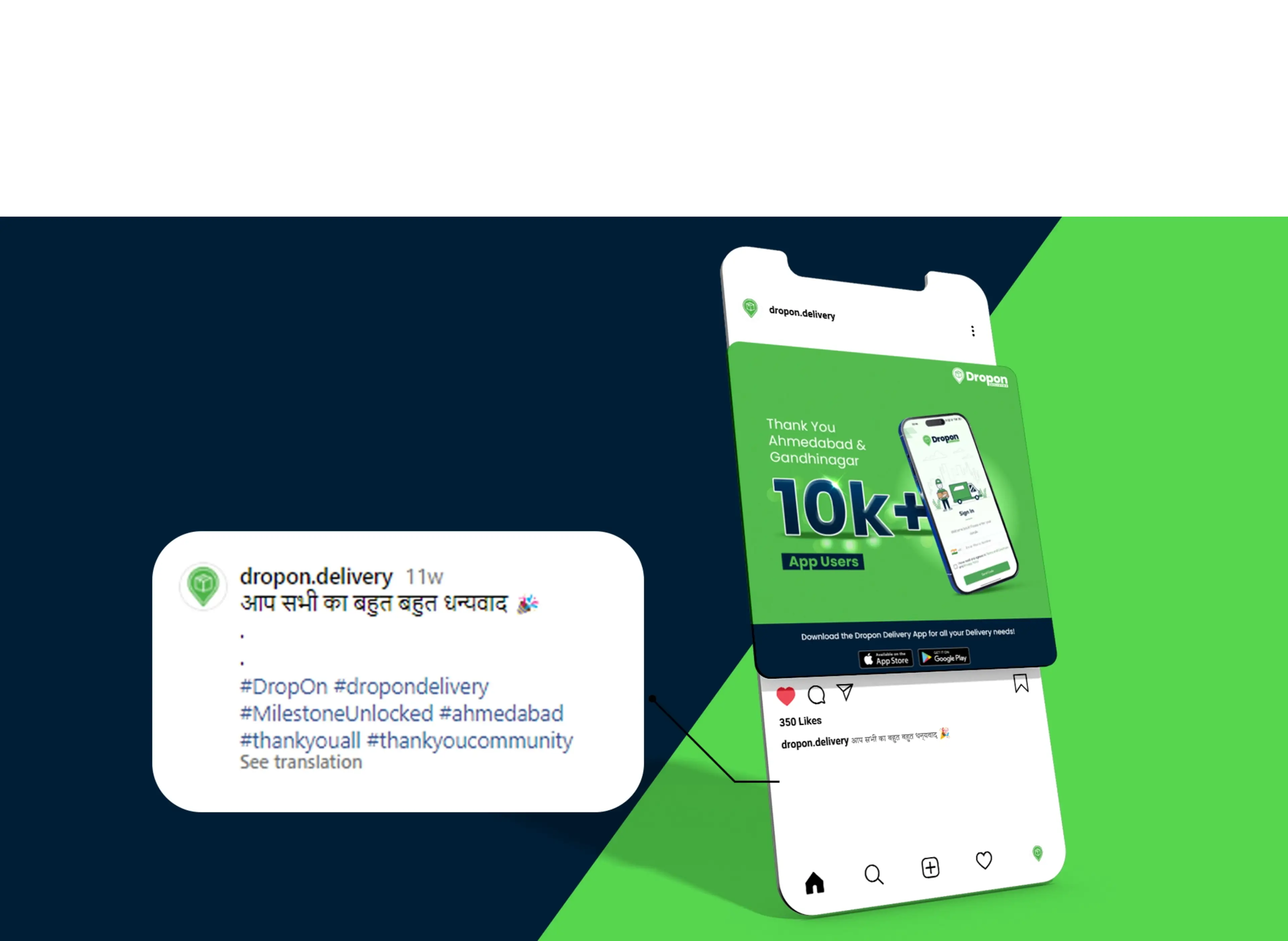 We developed a unique moment marketing calendar tailored to Ahmedabad’s pulse — mixing trending topics with regional humour and Gujarati slang. This helped Dropon cut through the clutter, resonating with both B2C users and small businesses looking for reliable delivery partners.