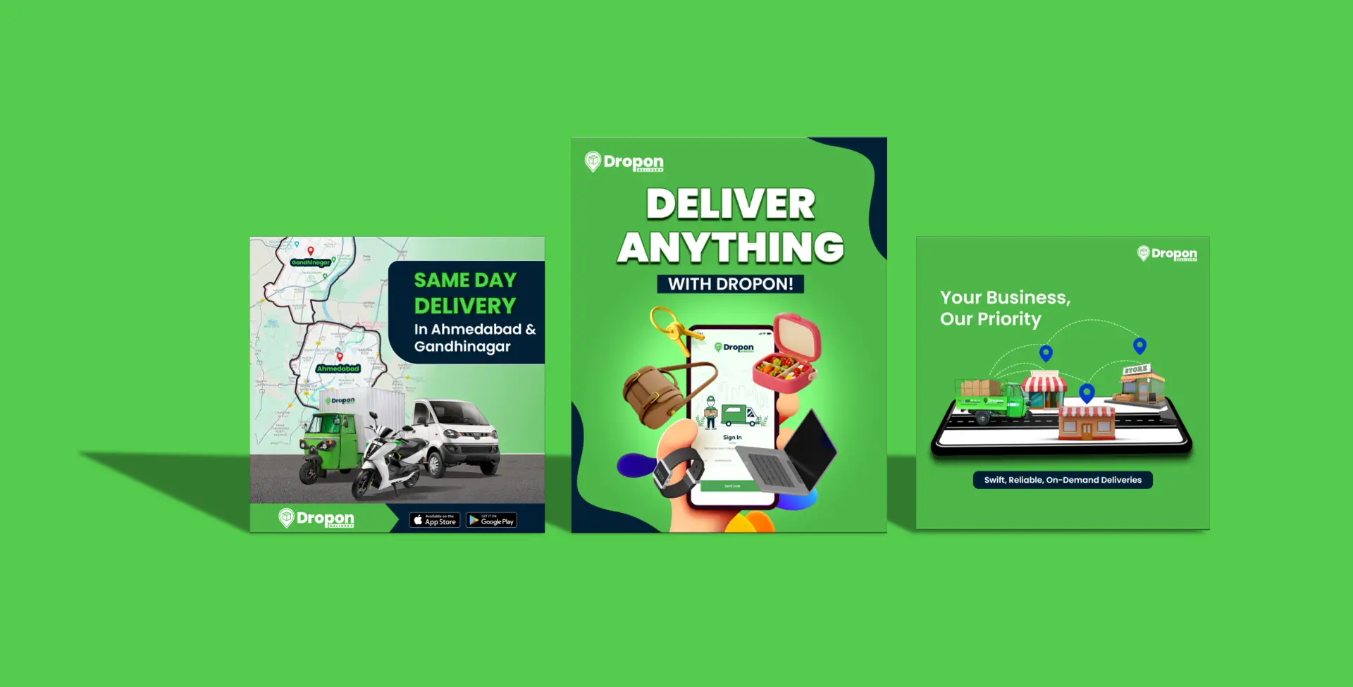 Dropon entered the competitive on-demand delivery space with a hyperlocal vision — fast, reliable, and Ahmedabad-first. Bloop led the brand’s digital journey from scratch, starting with its logo identity and launch strategy to position Dropon as a youthful, relatable, and trustworthy app for everyday deliveries.