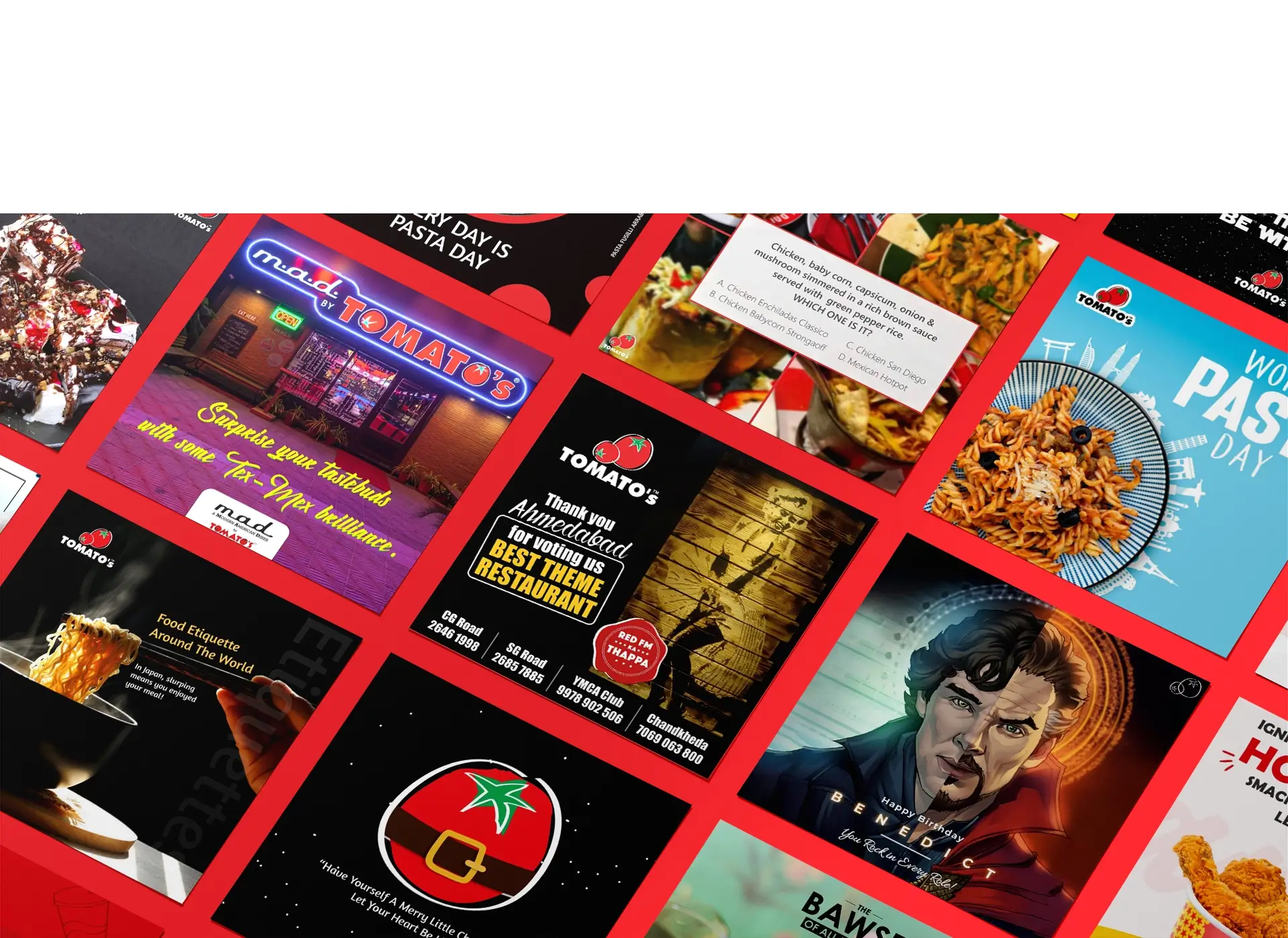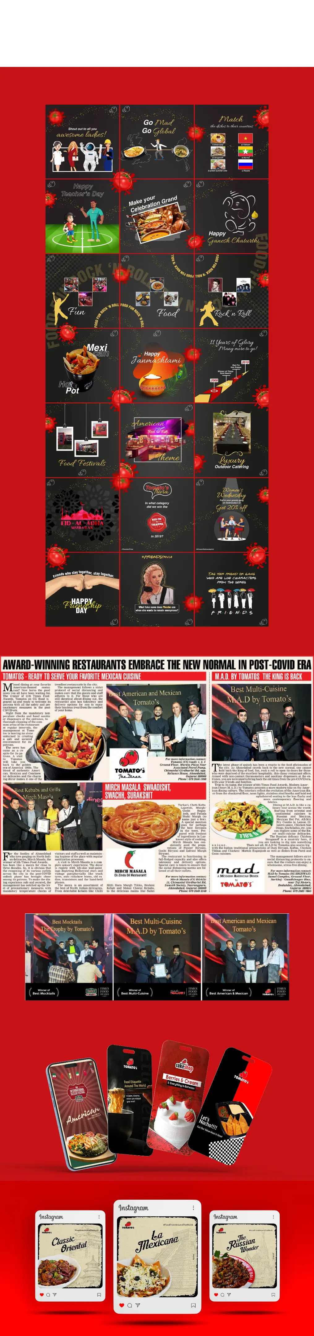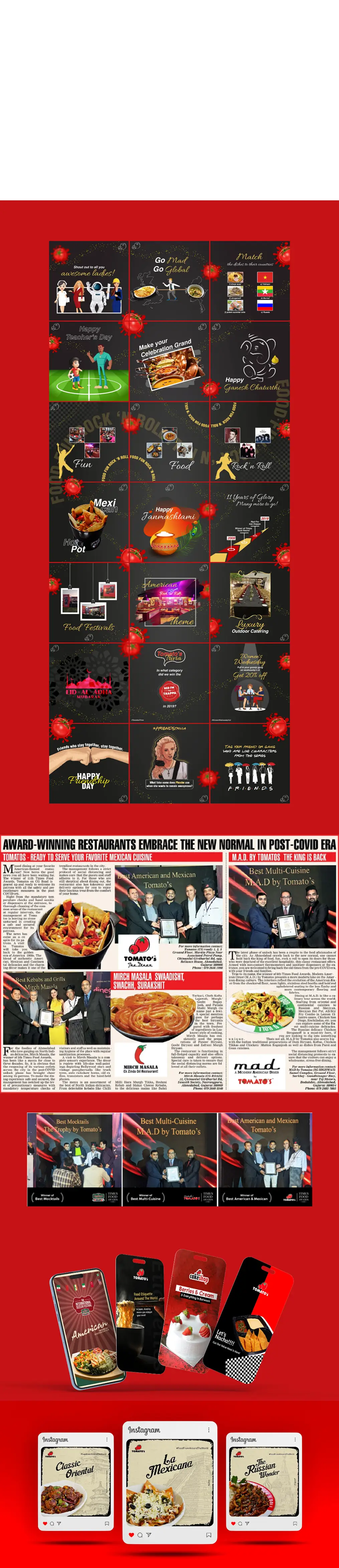 To maintain consistency and reinforce recall, we developed structured monthly grids that showcased the brand’s offers, ambience, and award recognitions. Dedicated visual templates, contests, and celebratory posts were executed to mark Tomato’s Times Food Award wins, helping the brand stay top-of-mind among food lovers.