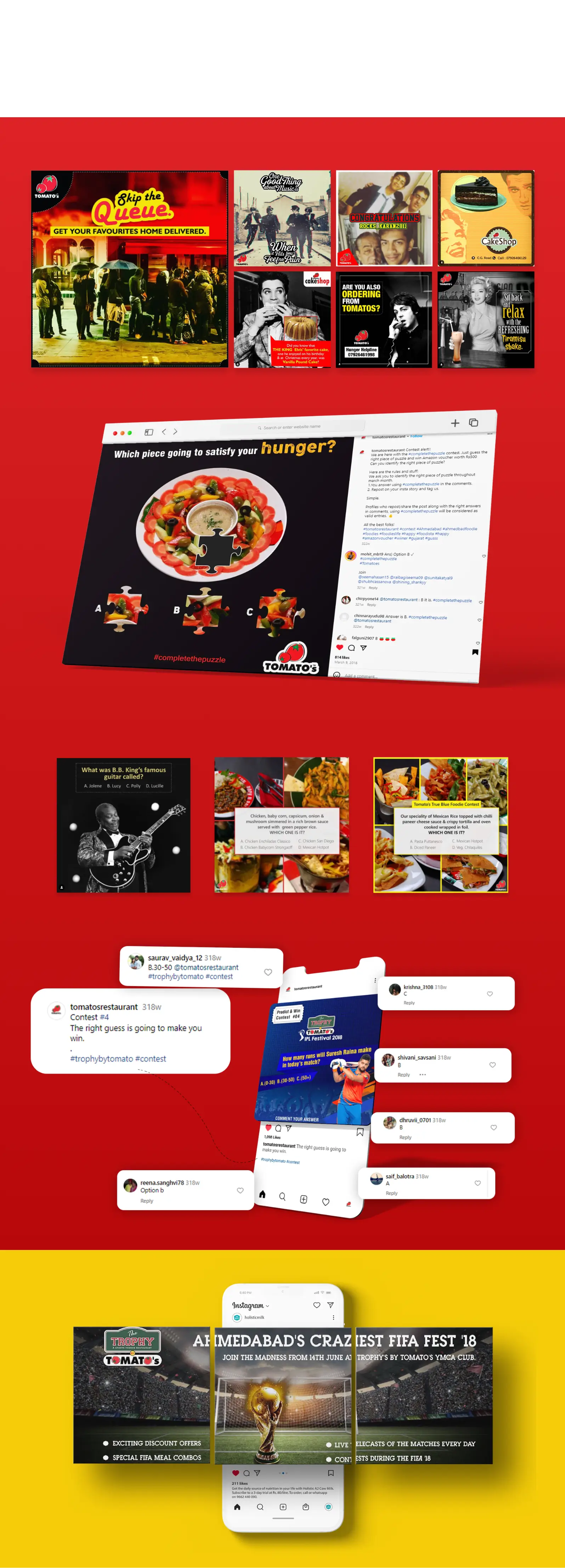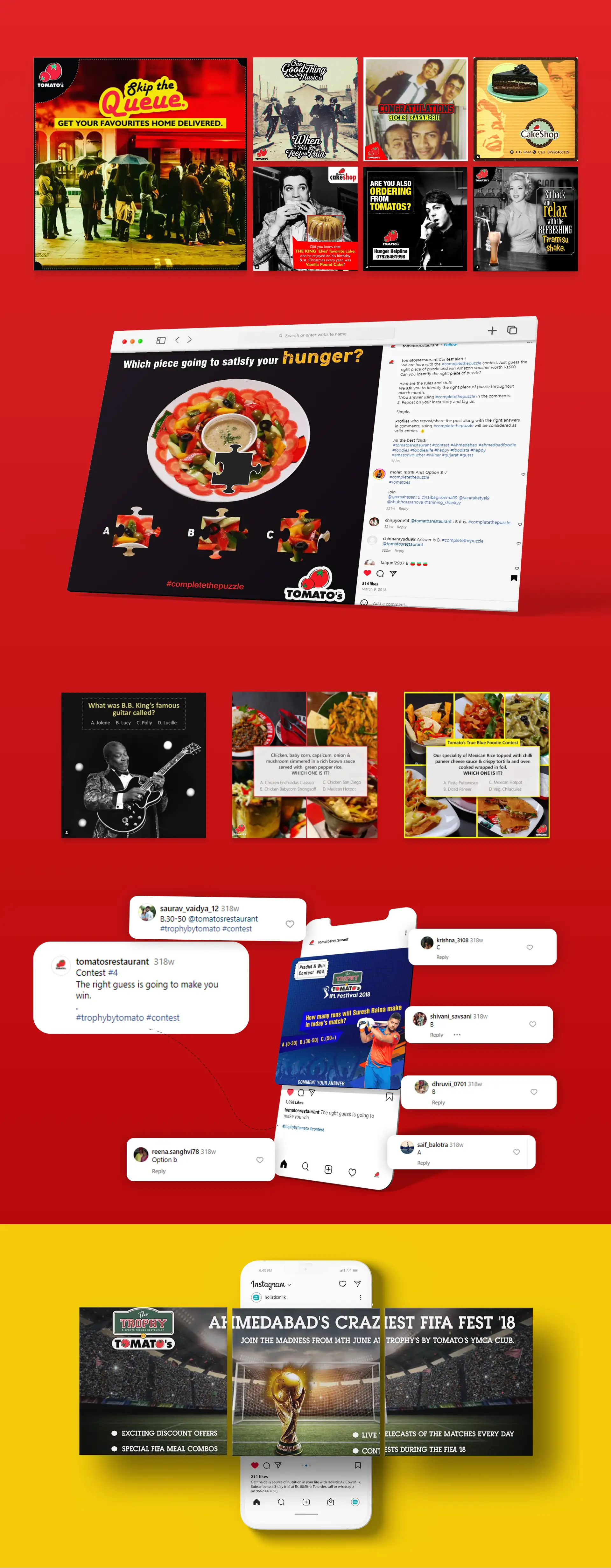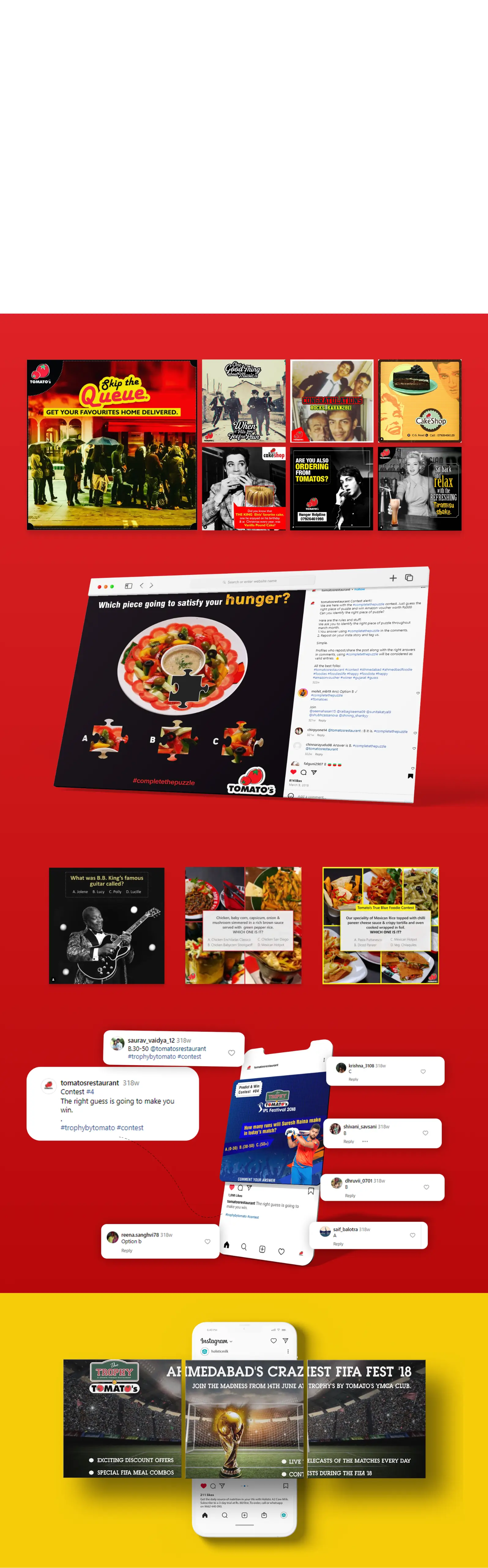 To maintain consistency and reinforce recall, we developed structured monthly grids that showcased the brand’s offers, ambience, and award recognitions. Dedicated visual templates, contests, and celebratory posts were executed to mark Tomato’s Times Food Award wins, helping the brand stay top-of-mind among food lovers.